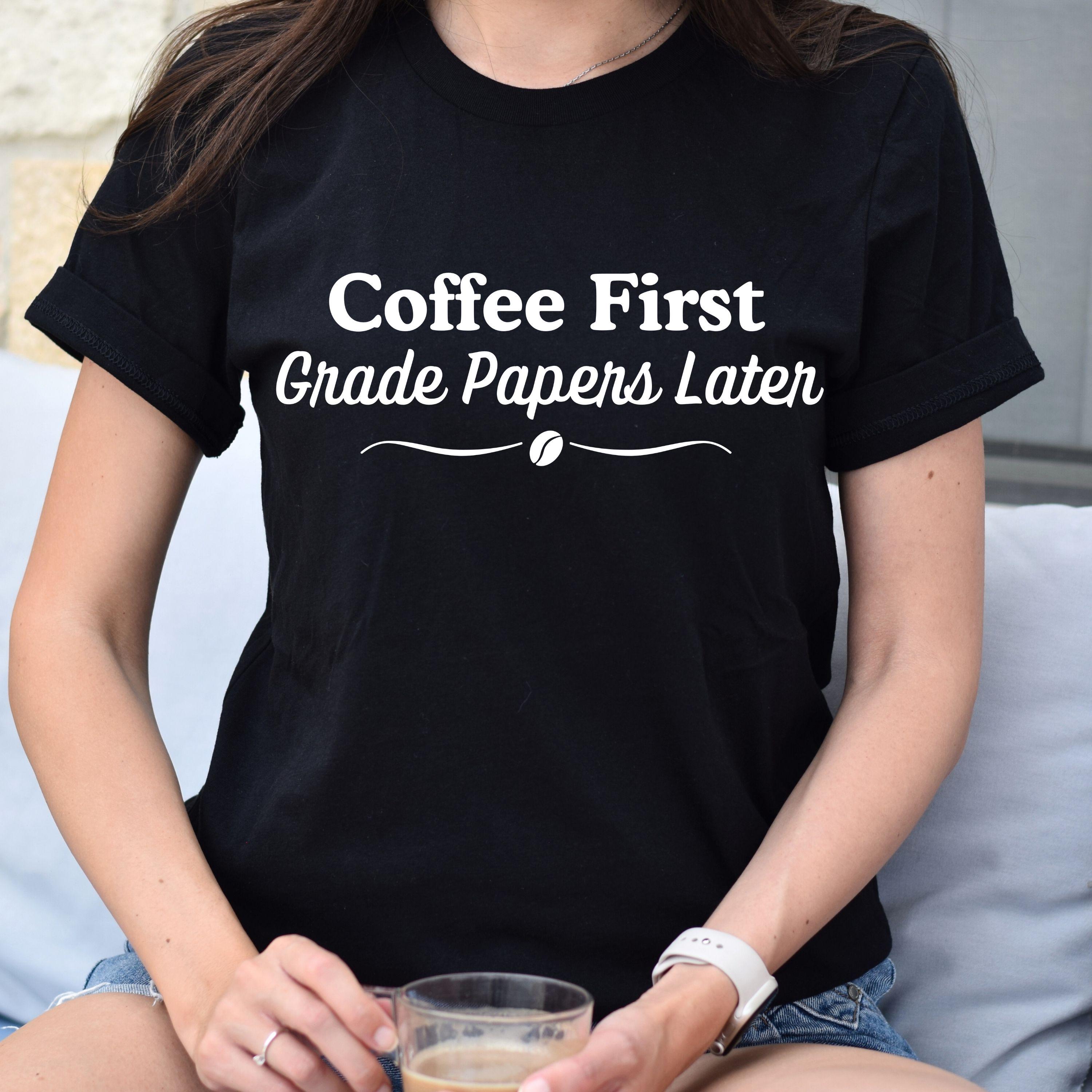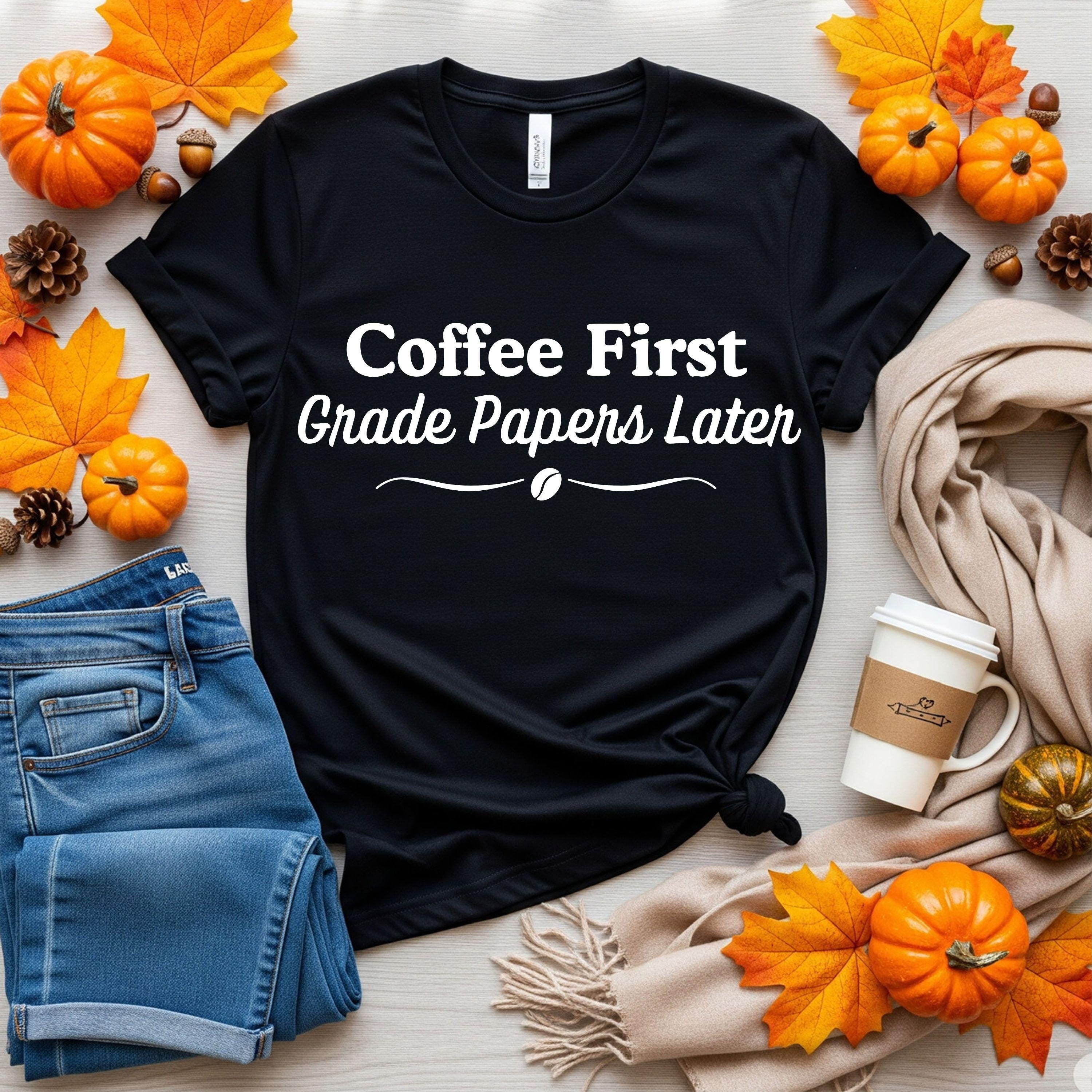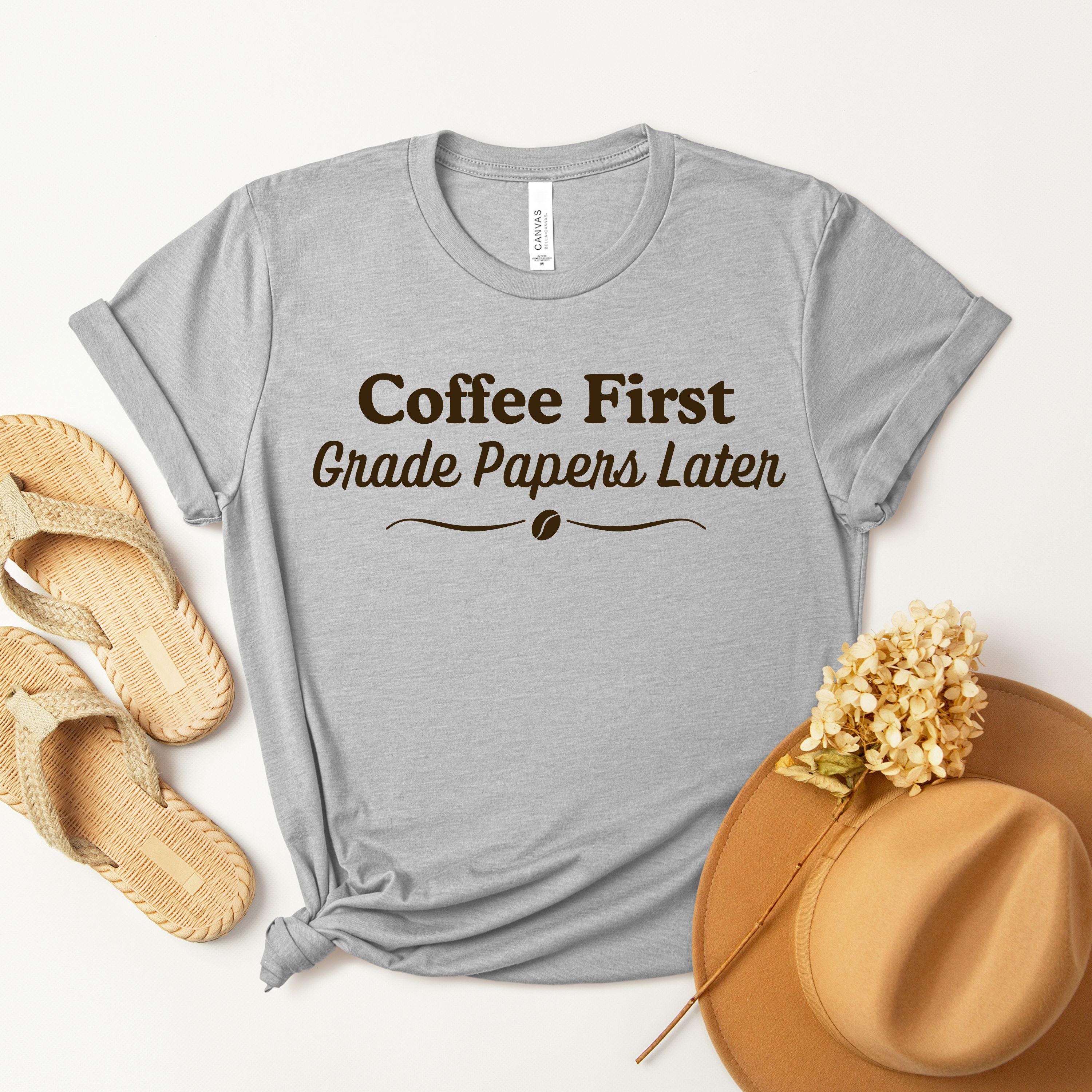 Coffee First Grade Papers Later Teacher Shirt | Funny Teacher T-Shirt | Teacher Gift for Women | Coffee Lover Teacher Top | Bella Canvas Tee