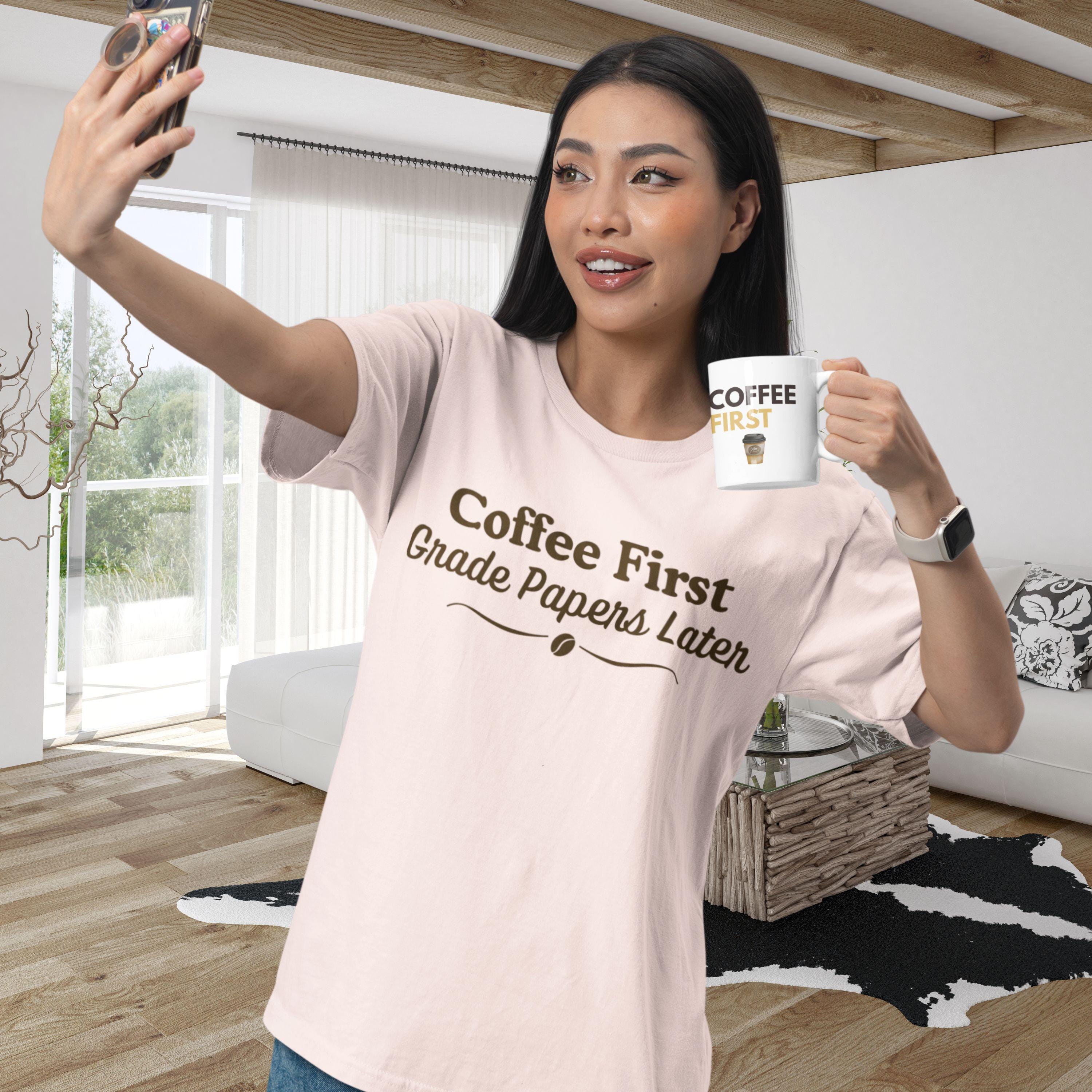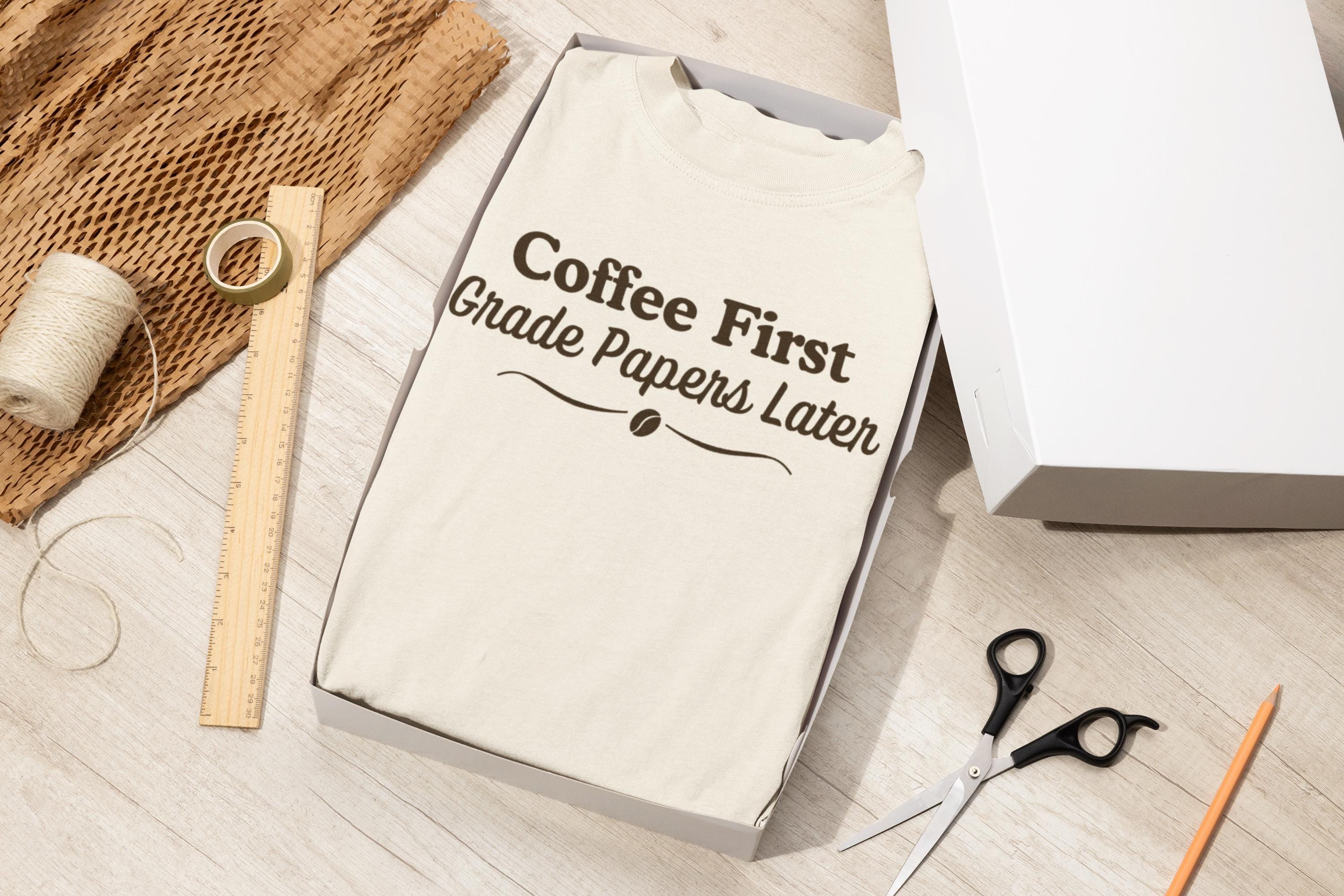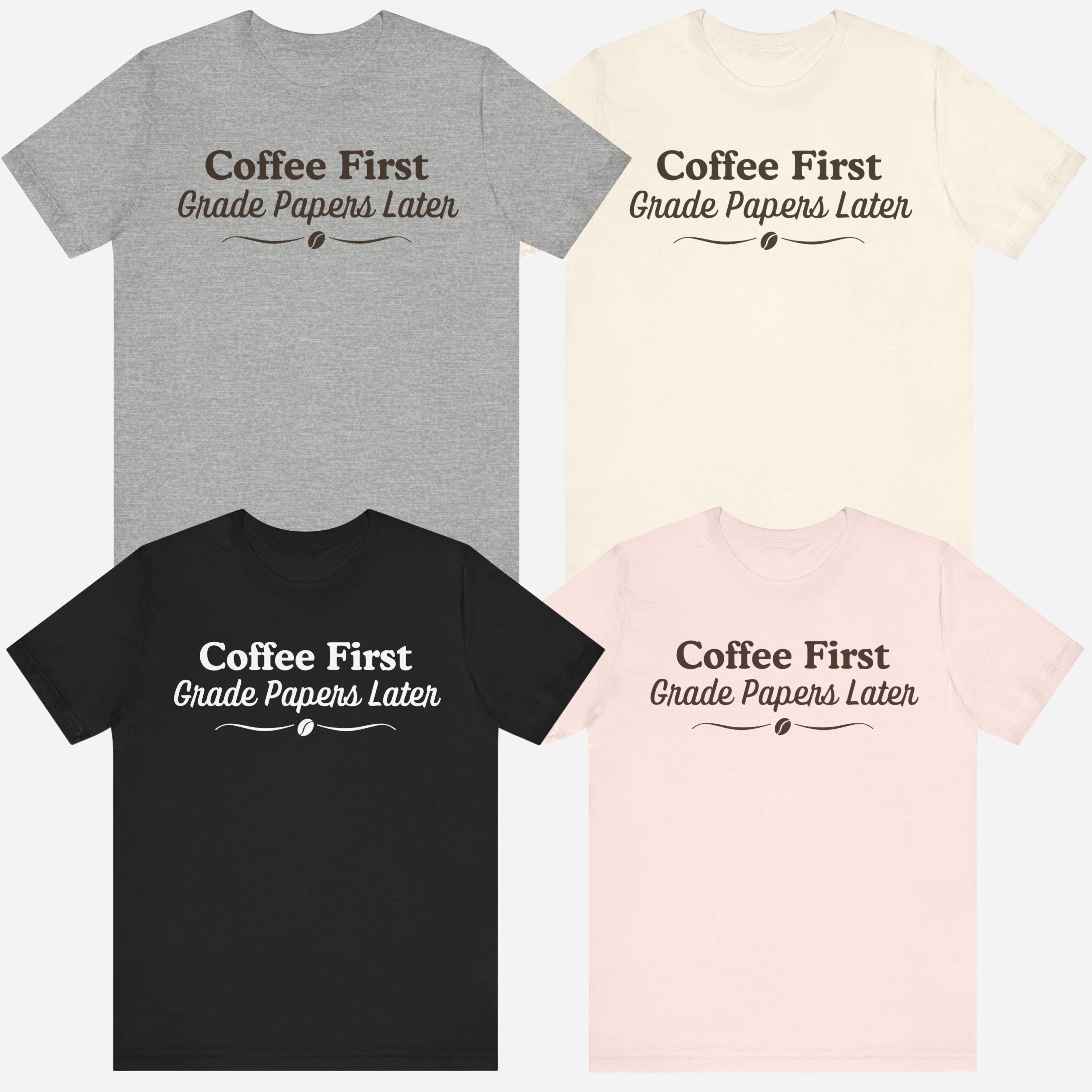 Coffee First Grade Papers Later Teacher Shirt | Funny Teacher T-Shirt | Teacher Gift for Women | Coffee Lover Teacher Top | Bella Canvas Tee