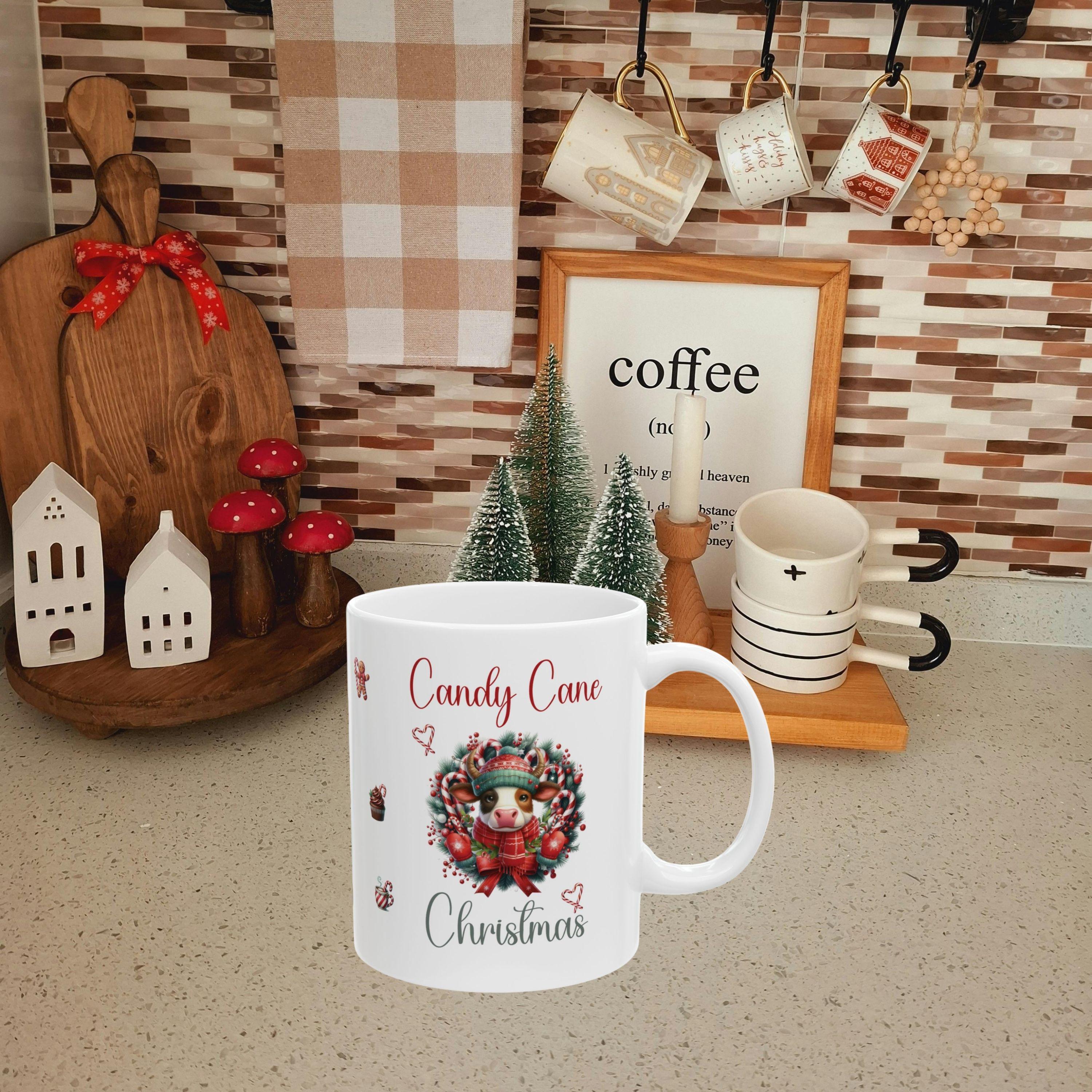 Bring a touch of cozy farmhouse charm to your holiday mornings with this Candy Cane Christmas Mug! Featuring an adorable cow wearing a winter hat, surrounded by candy canes, holly berries, and a festive wreath — this mug is the perfect way to sip your coffee, tea, or hot cocoa all season long.