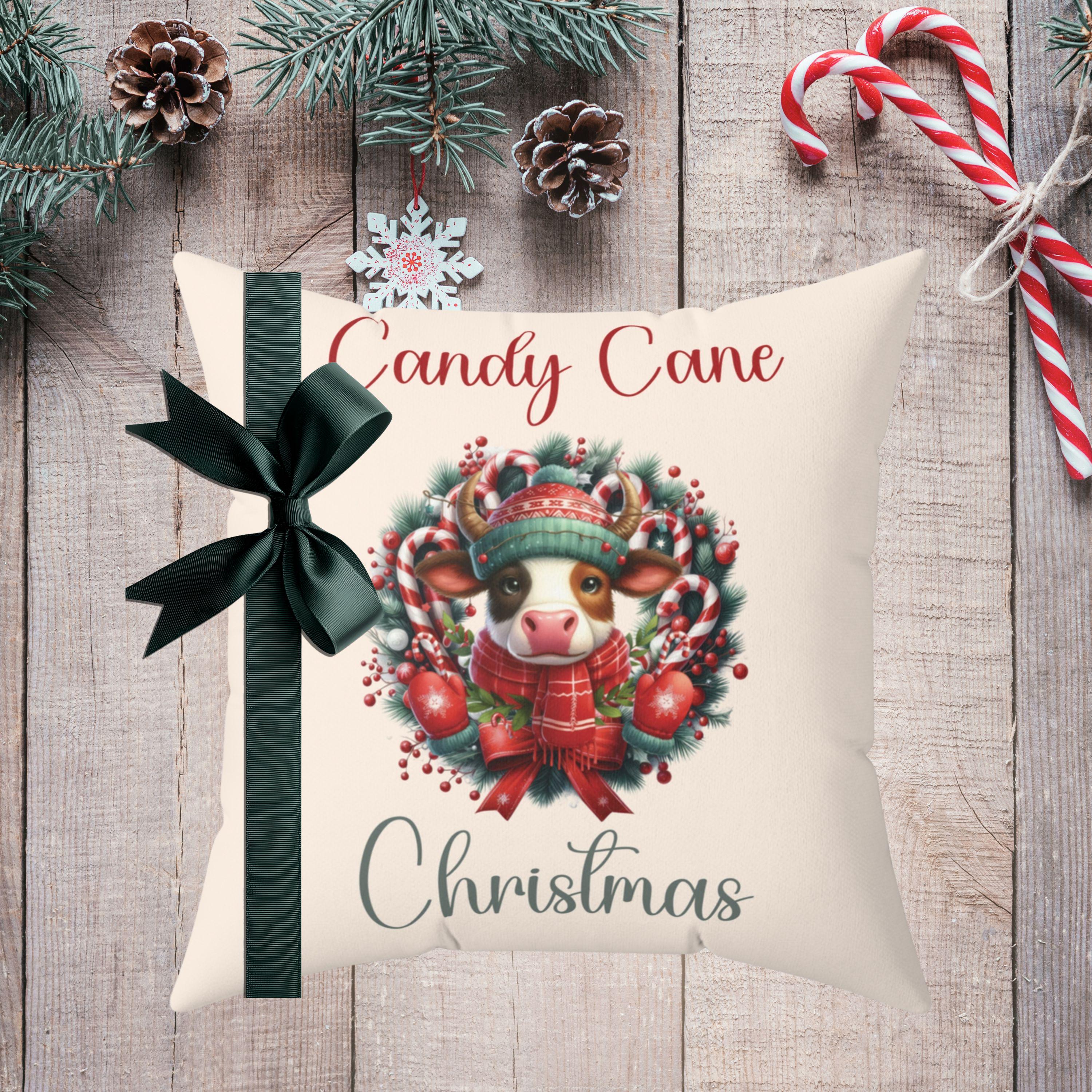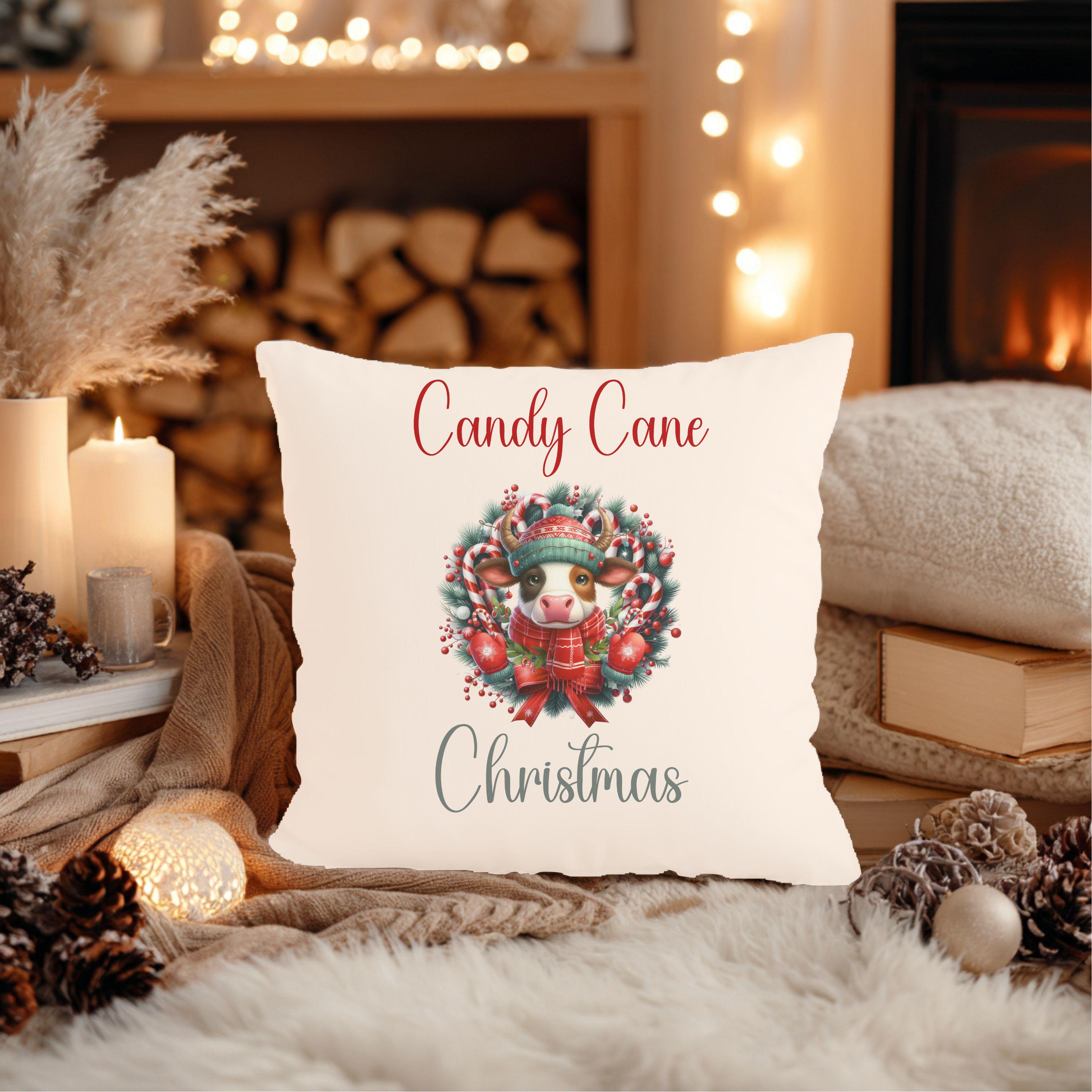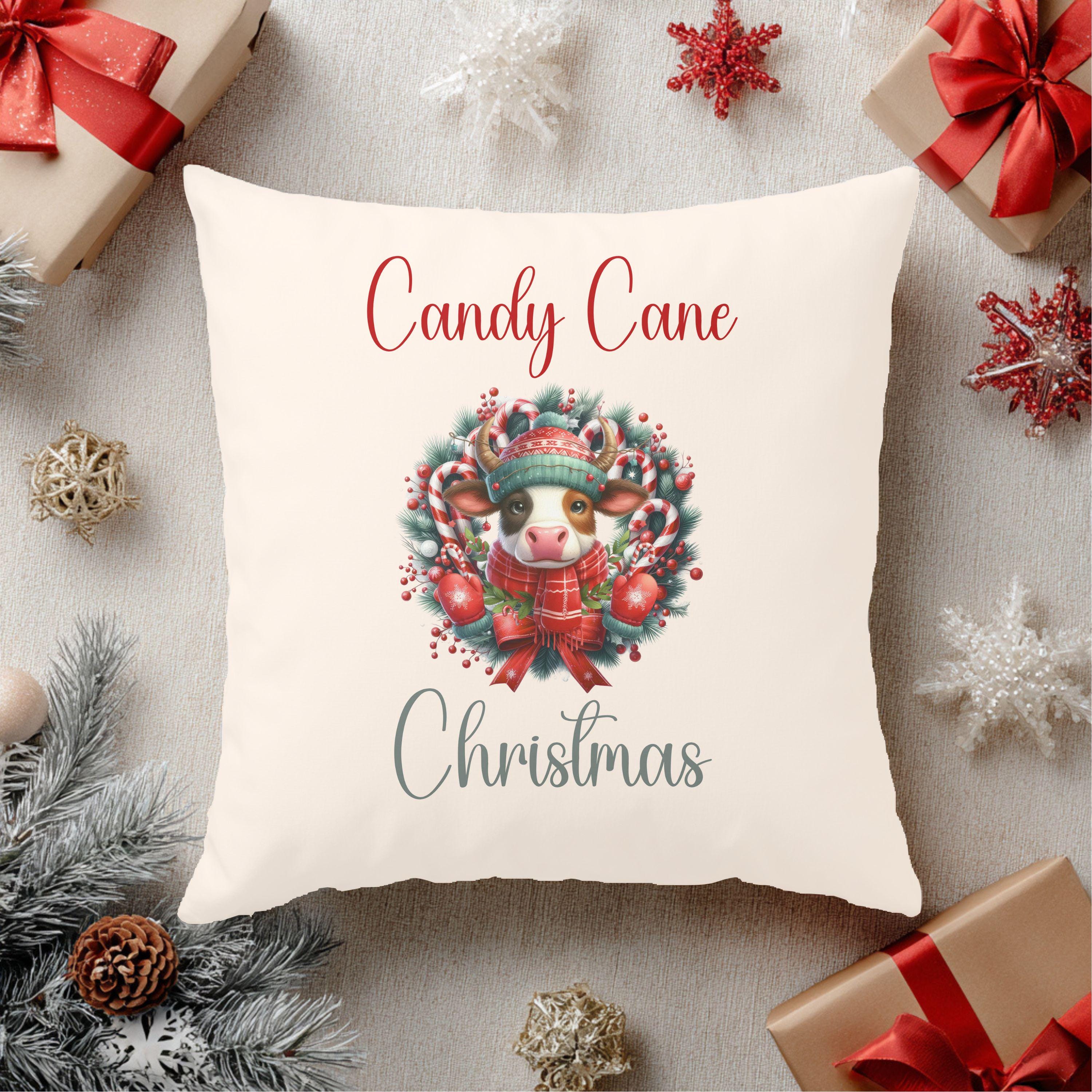 Candy Cane Christmas Pillow, Cow in Wreath Cushion, Double Sided Christmas Throw Pillow, Cozy Holiday Home Decor, Giftable Pillow Cover