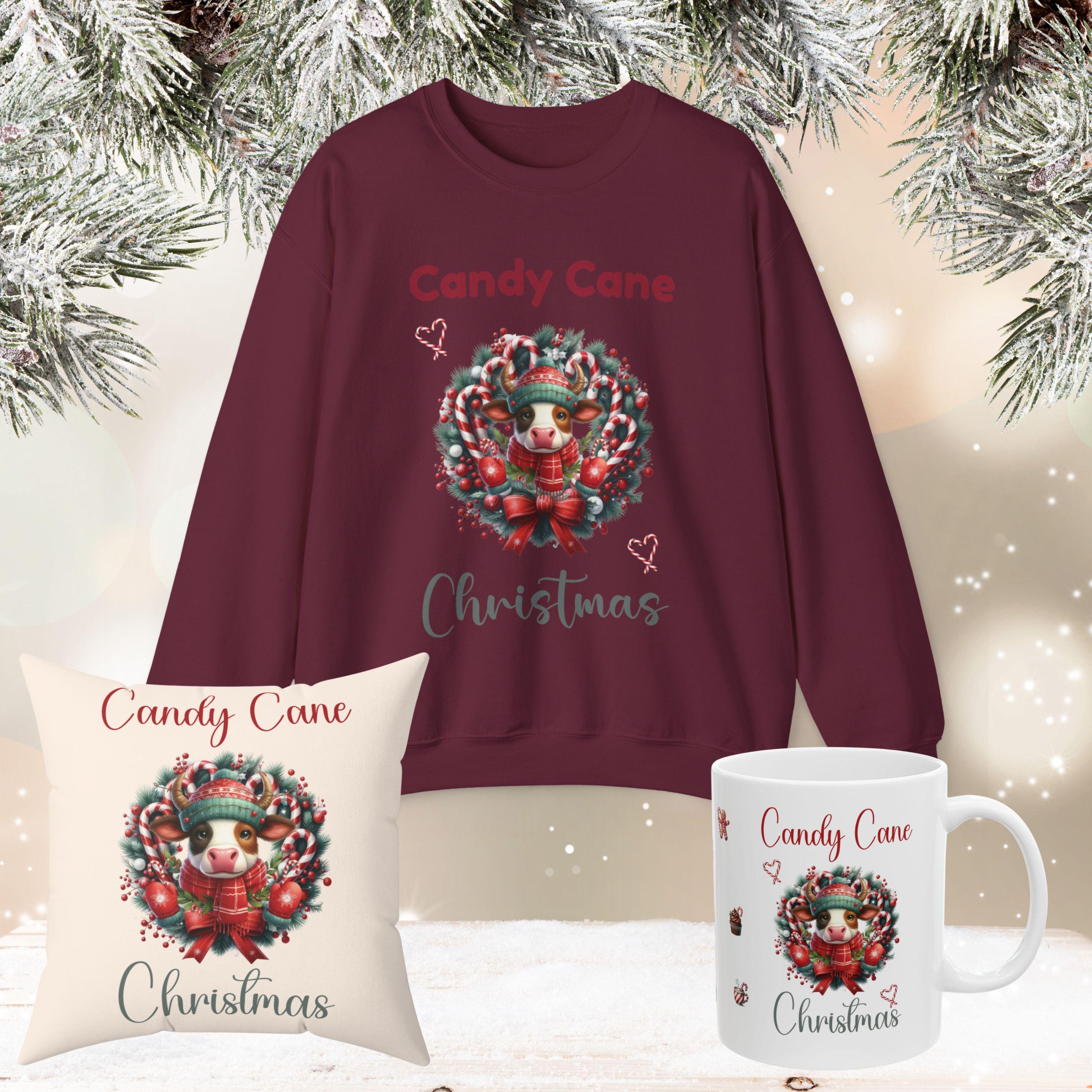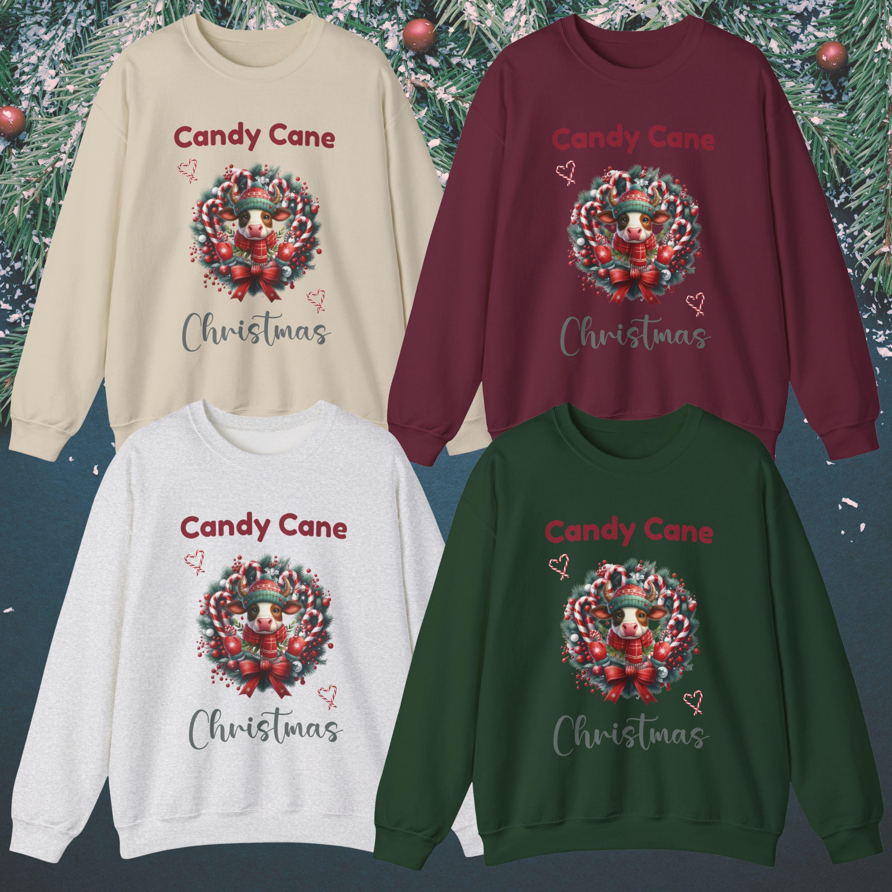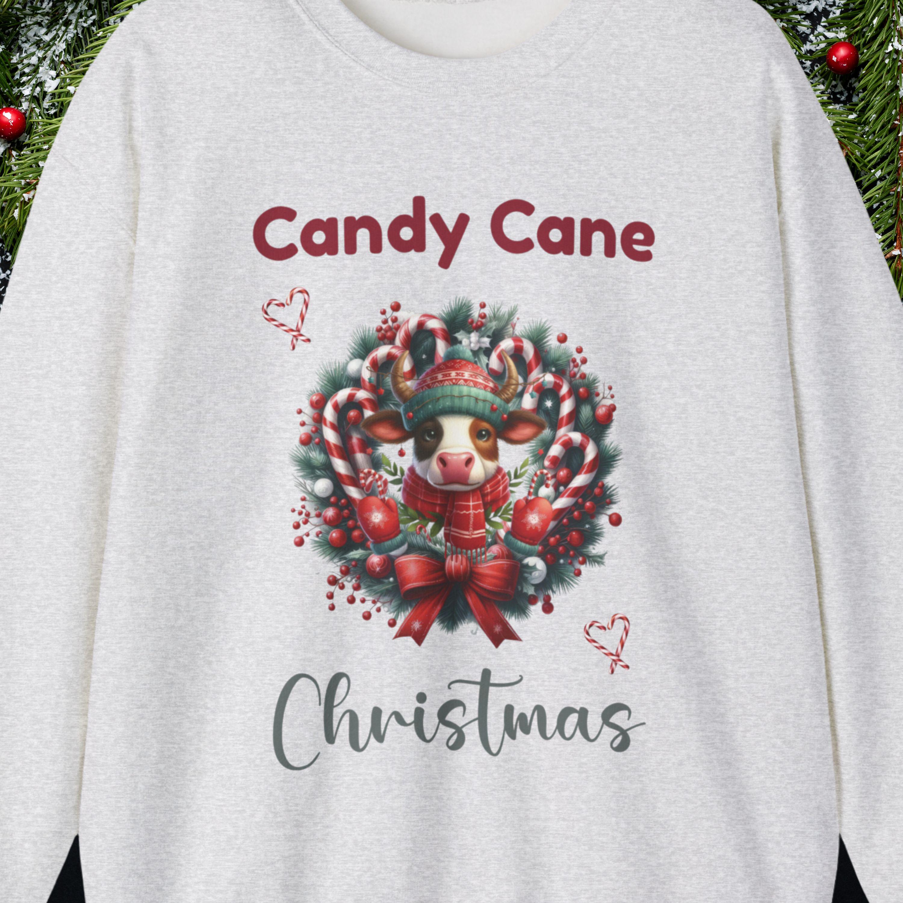Candy Cane Christmas Sweatshirt, Cow in Holiday Wreath Crewneck, Cute Christmas Sweater Gift, Cozy Winter Sweatshirt, Holiday Apparel