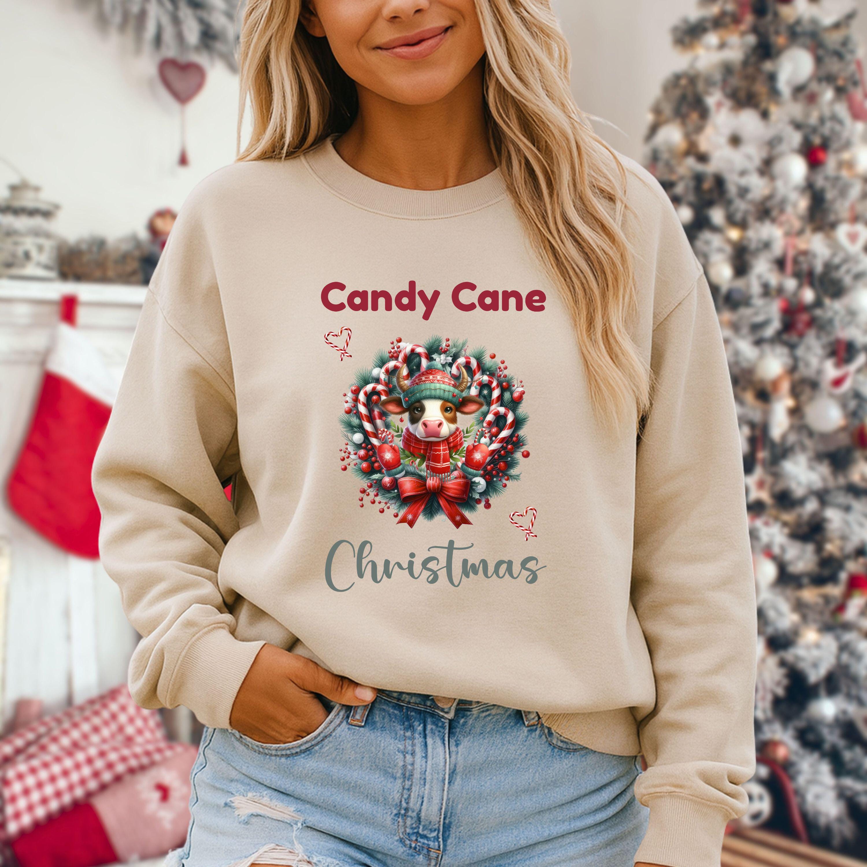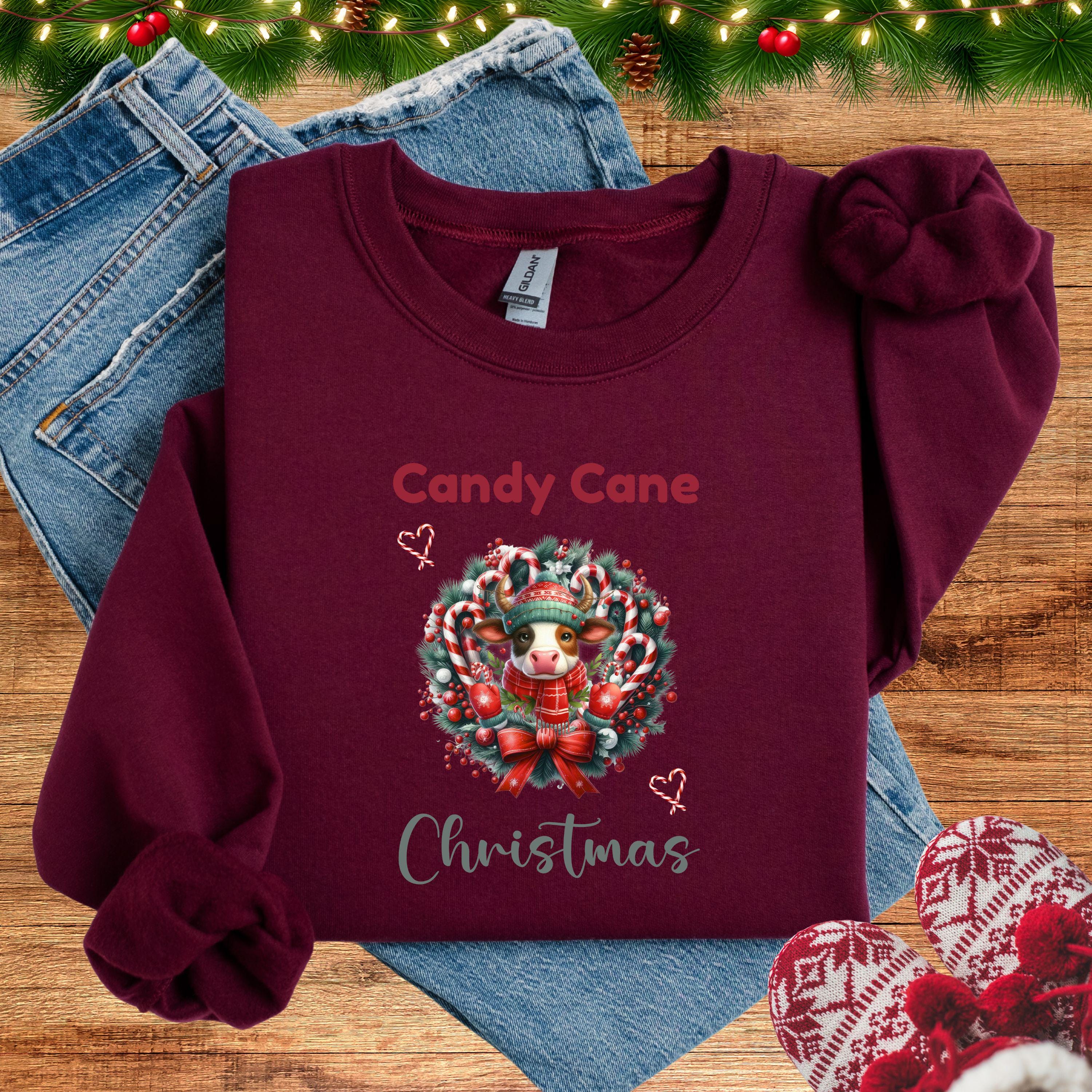 Celebrate the sweetest season with our Candy Cane Christmas Sweatshirt! Featuring an adorable cow wrapped in candy canes and holiday cheer, this cozy crewneck is perfect for Christmas morning, cookie baking, or watching your favorite holiday movies.